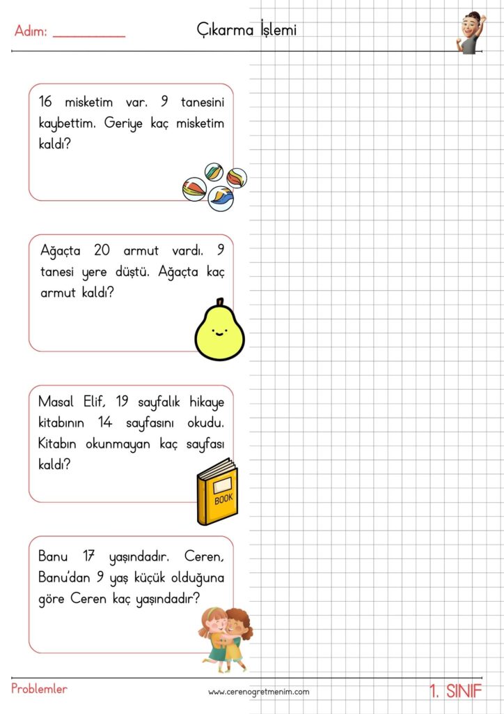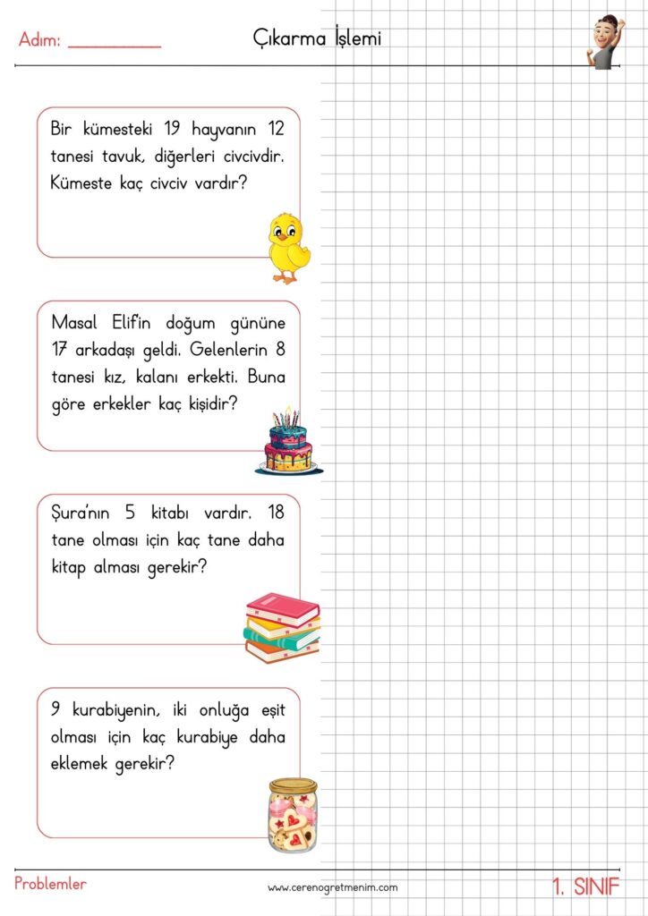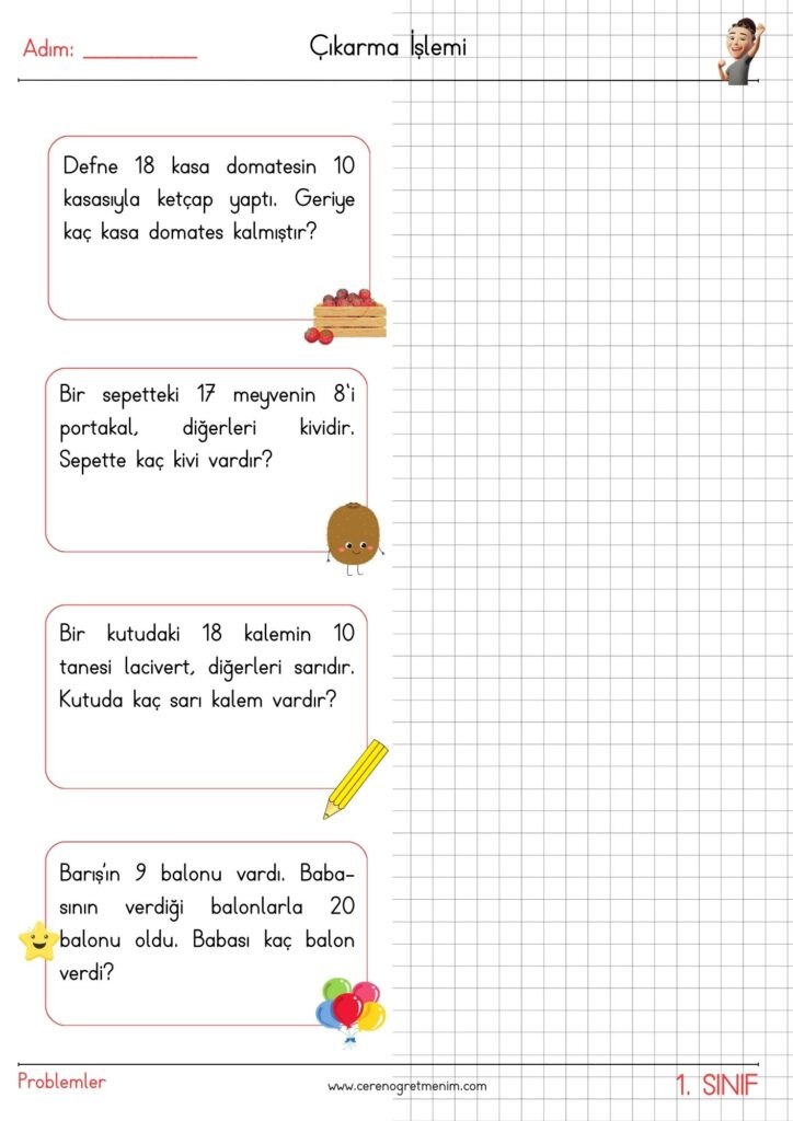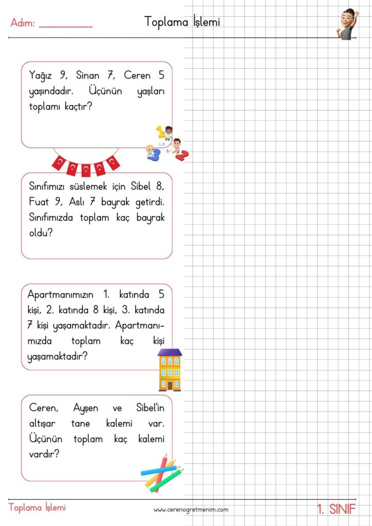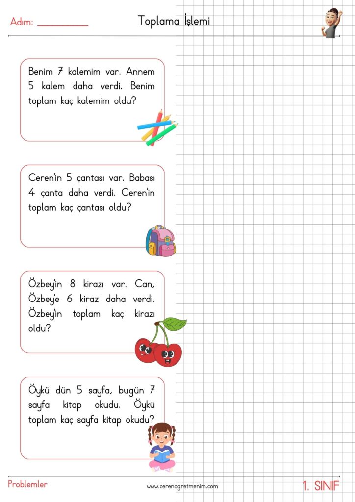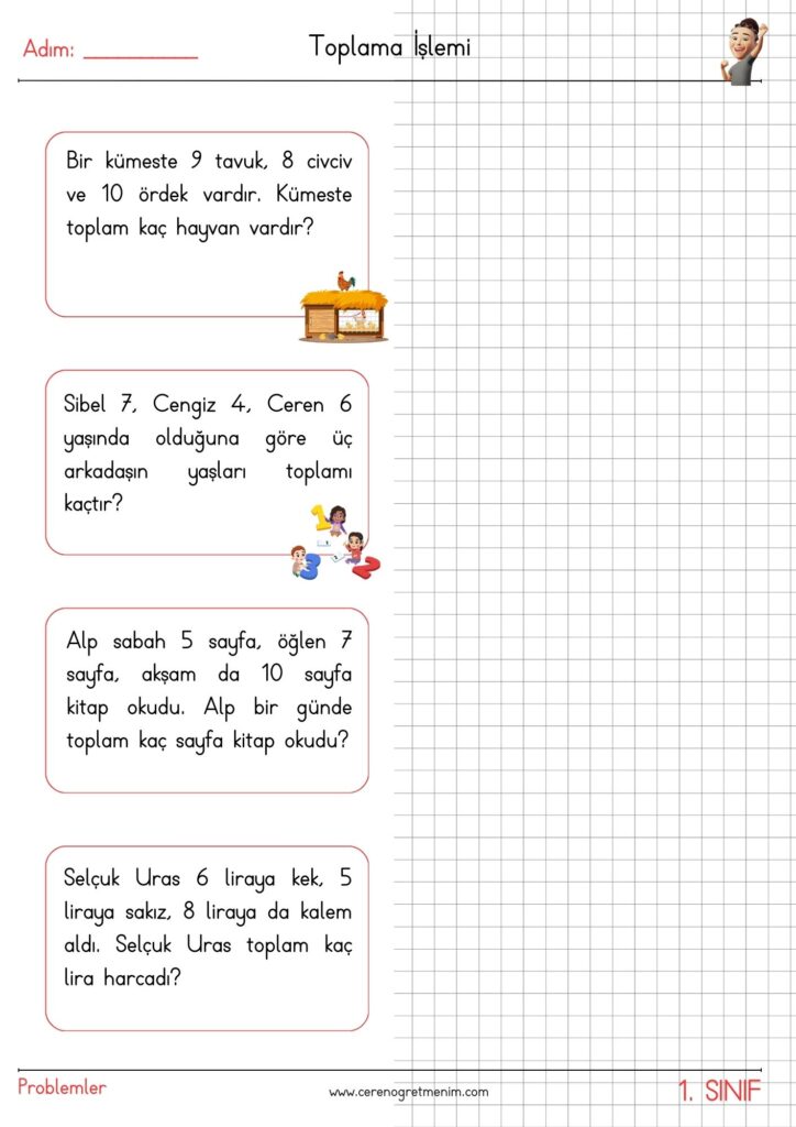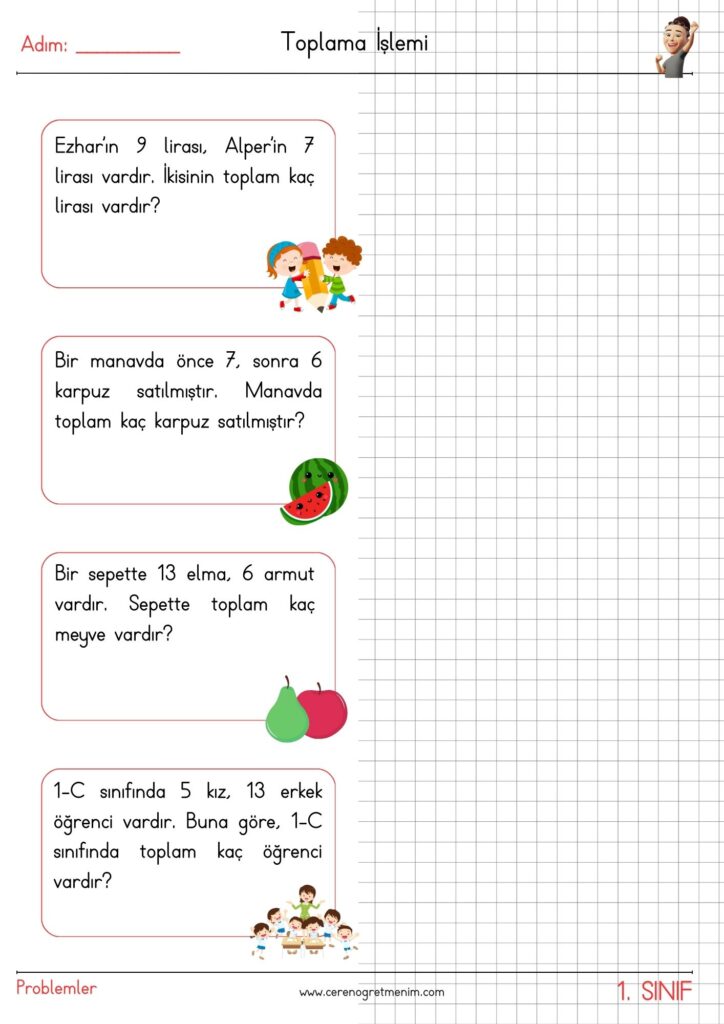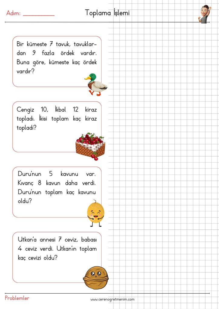 Matematik problemleri için hazırlanmış eğlenceli ve öğretici etkinlikler! Toplama işlemi içeren günlük hayat problemleriyle öğrencilerin problem çözme becerilerini geliştirin. Yazdırılabilir