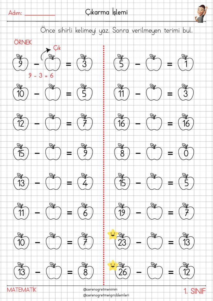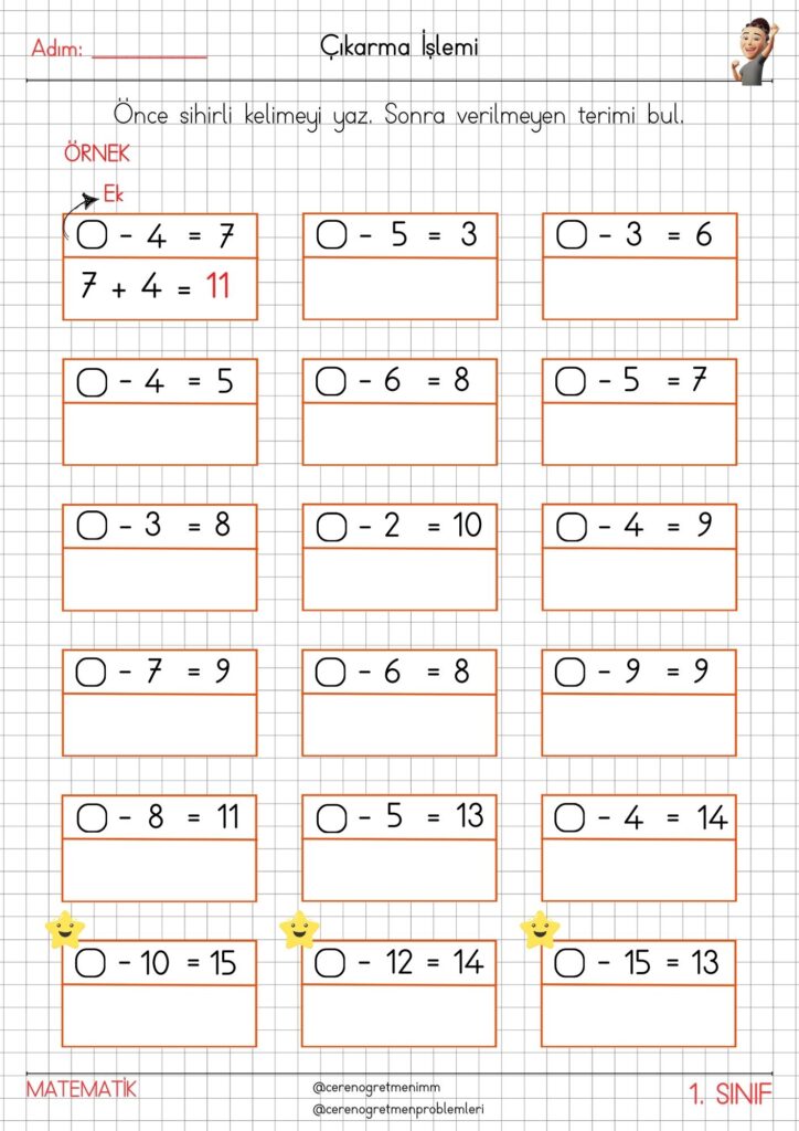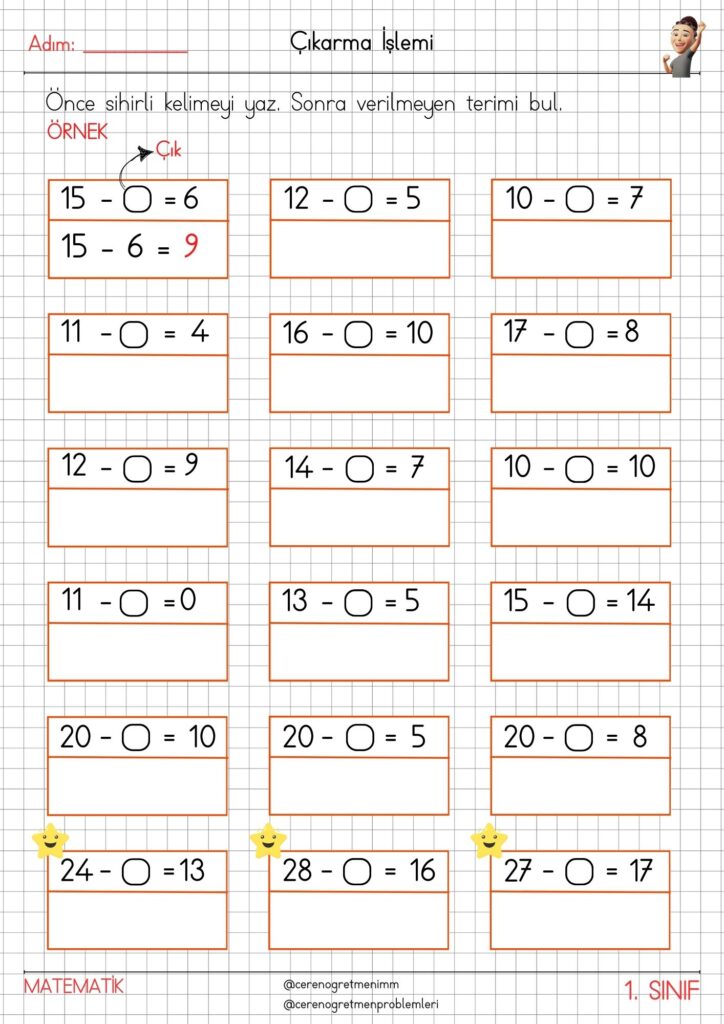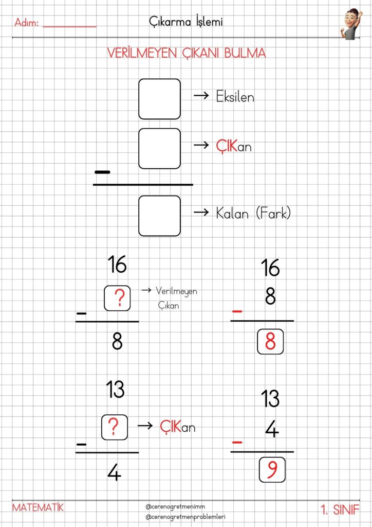 Çıkanı bulma etkinlikleri ve defter notu. Çıkarma işleminde çıkanı bulmayı öğreten, öğrencilerin işlem ve problem çözme becerilerini geliştiren çalışma. 📚✏️