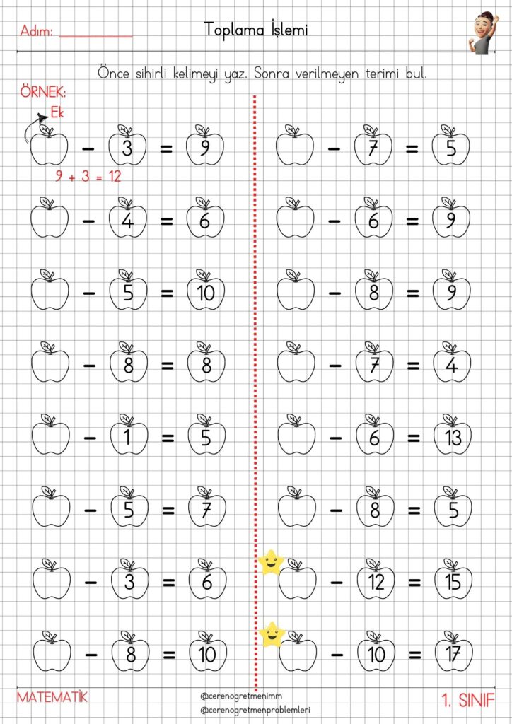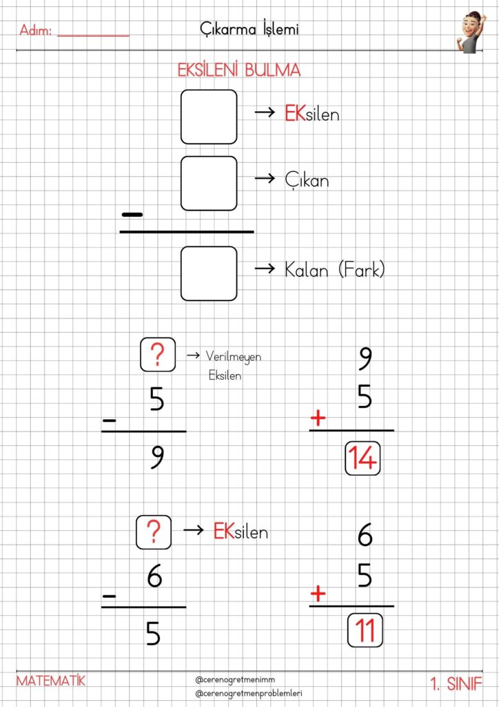 Eksileni bulma etkinlikleri ve defter notu. Çıkarma işleminde eksileni bulmayı öğreten, öğrencilerin işlem becerilerini geliştiren çalışma. 📚✏️