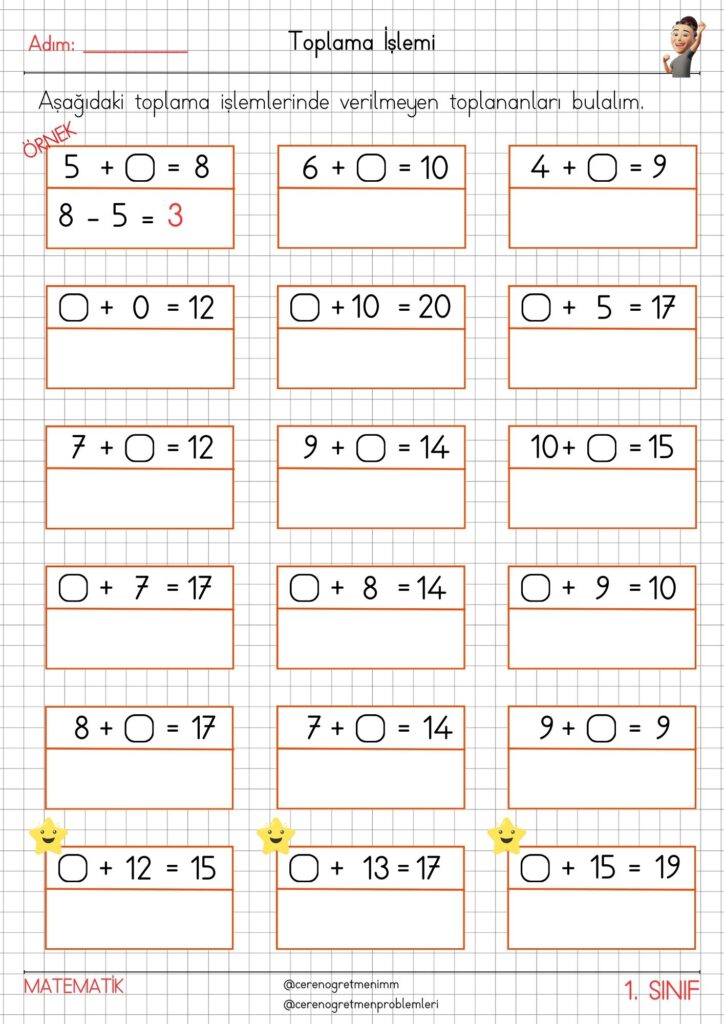 Matematikte verilmeyen toplananı bulma konusu için kısa, net ve anlaşılır örneklerle desteklenen etkinlikler ve defter notları…
