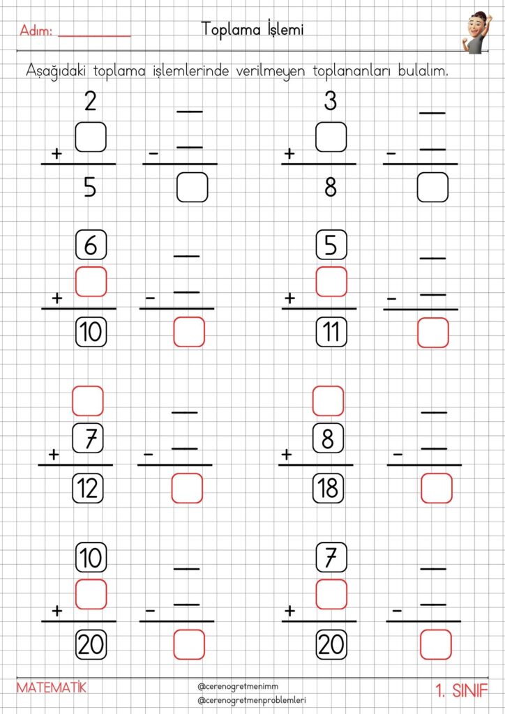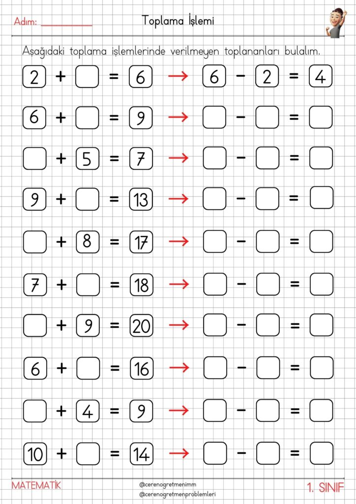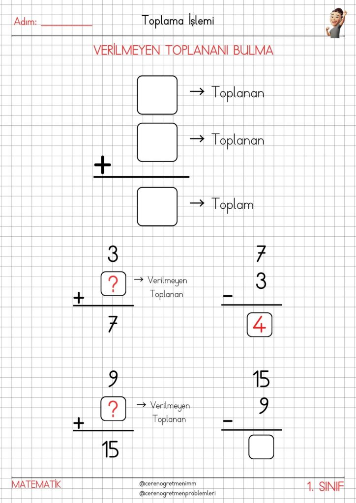 Matematikte verilmeyen toplananı bulma konusu için kısa, net ve anlaşılır örneklerle desteklenen etkinlikler ve defter notları…