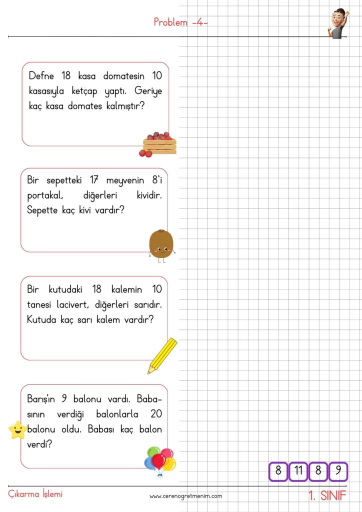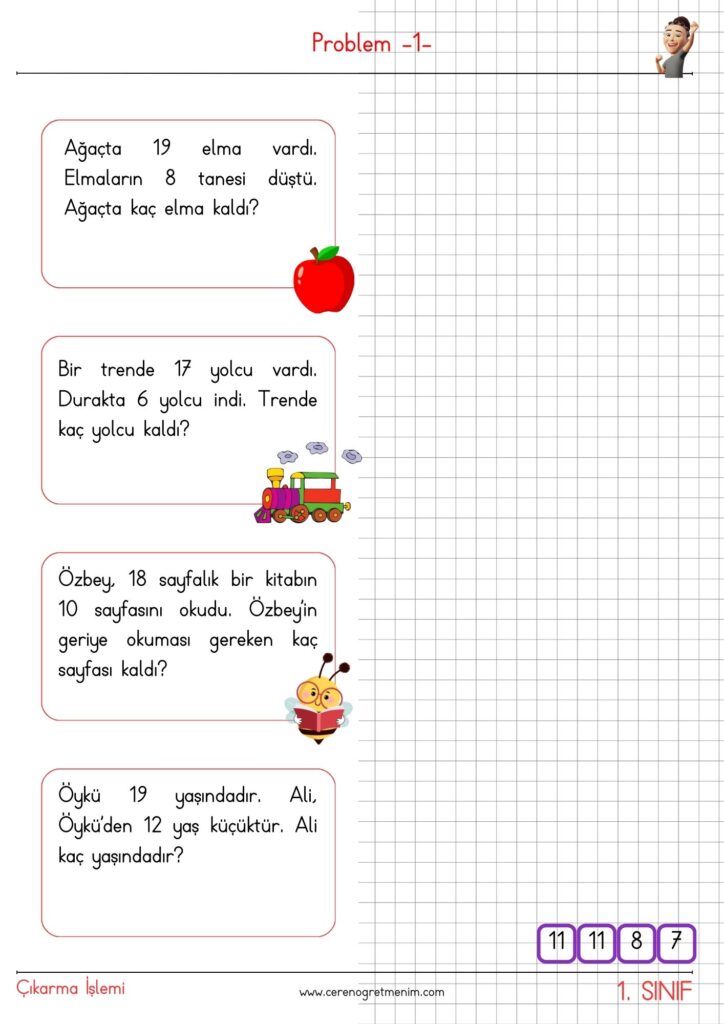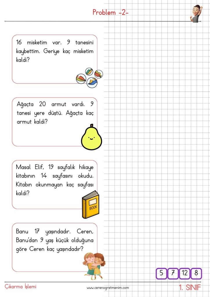Çıkarma işlemi için eğlenceli ve öğretici etkinlikler! Çocukların matematik becerilerini geliştiren kolay ve anlaşılır çalışma sayfalarını keşfedin Problem -1-