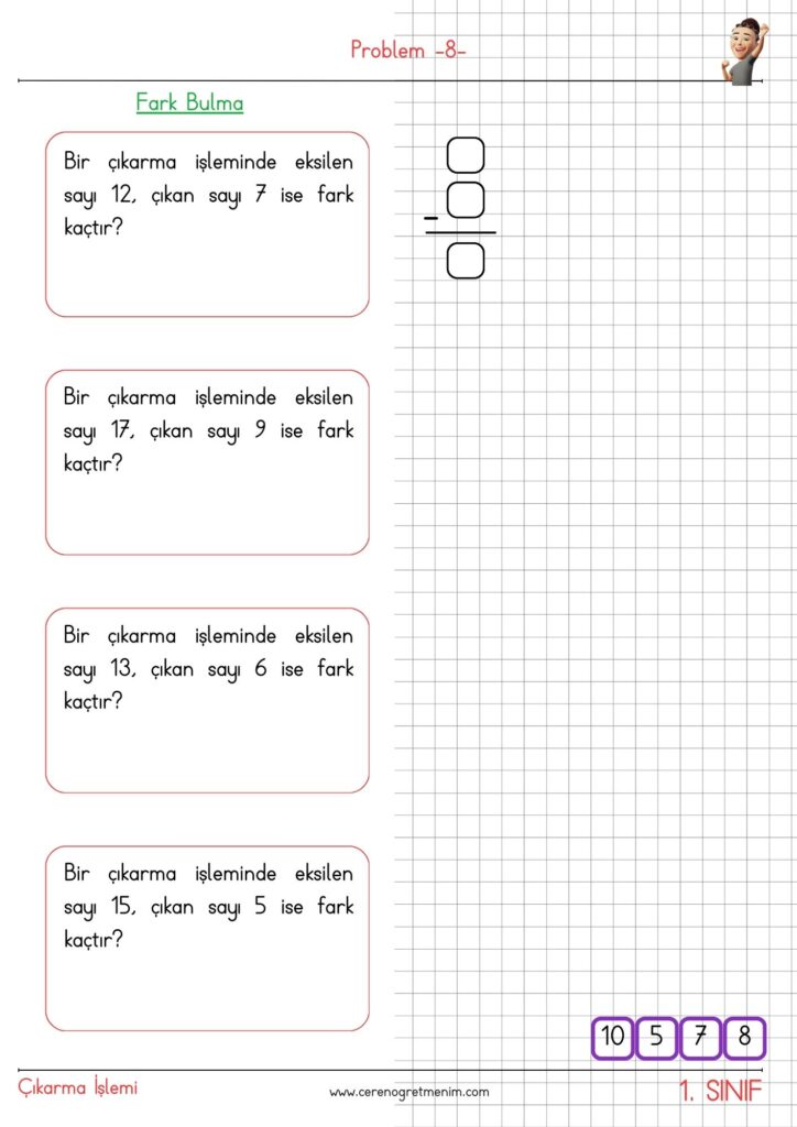 Çıkarma işlemi terimleri ve farkı bulma etkinlikleri! Çocukların matematik becerilerini geliştiren eğlenceli ve kolay çalışma sayfalarını keşfedin. Problem -8-