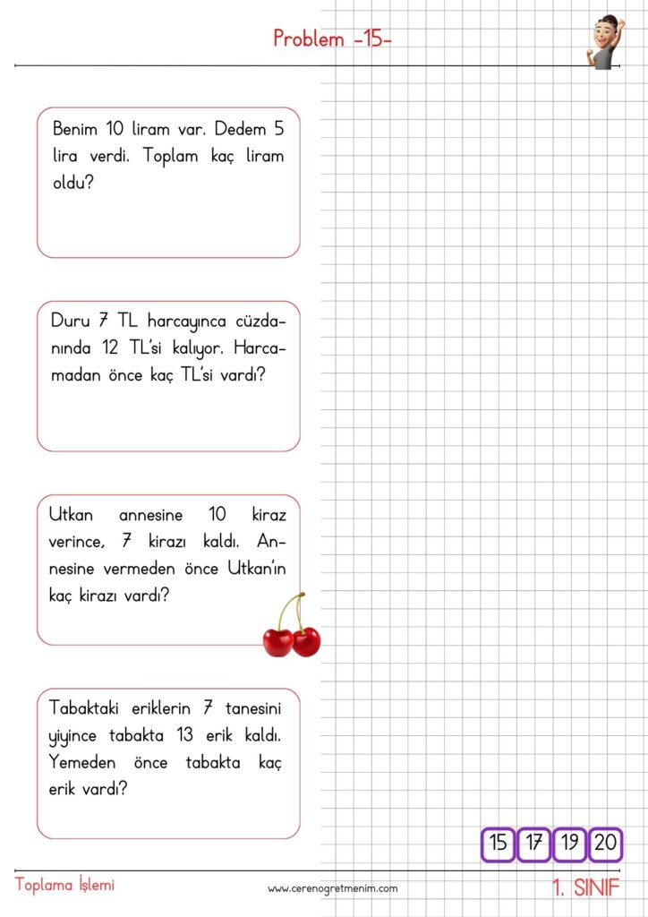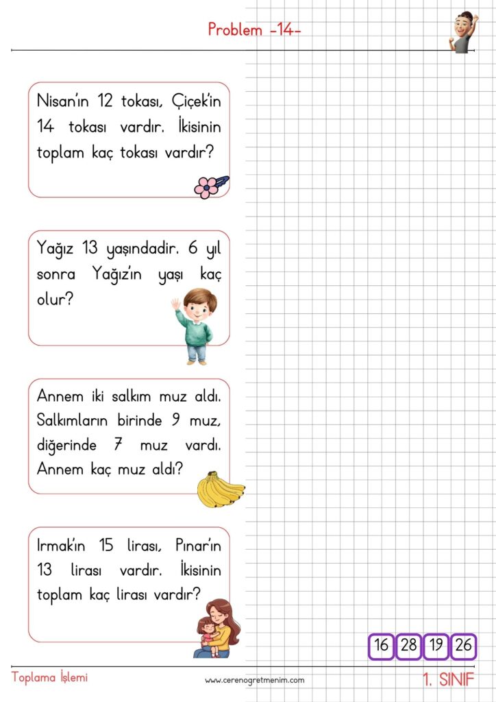 Toplama işlemi için eğlenceli ve öğretici etkinlikler! Çocukların matematik becerilerini geliştiren kolay ve anlaşılır çalışma sayfalarını keşfedin. Problem -16-
