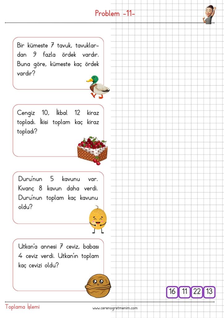 Toplama işlemi için eğlenceli ve öğretici etkinlikler! Çocukların matematik becerilerini geliştiren kolay ve anlaşılır çalışma sayfalarını keşfedin. Problem -11-