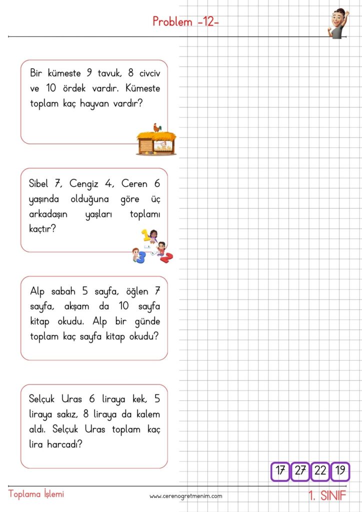 Toplama işlemi için eğlenceli ve öğretici etkinlikler! Çocukların matematik becerilerini geliştiren kolay ve anlaşılır çalışma sayfalarını keşfedin. Problem -12-