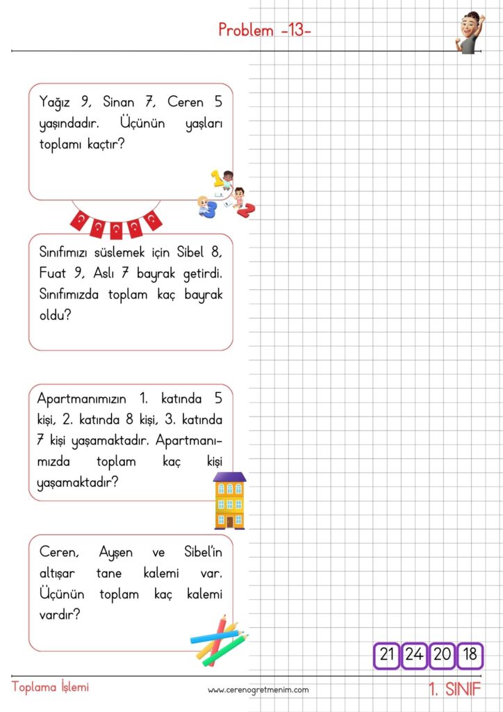 Toplama işlemi için eğlenceli ve öğretici etkinlikler! Çocukların matematik becerilerini geliştiren kolay ve anlaşılır çalışma sayfalarını keşfedin. Problem -13-