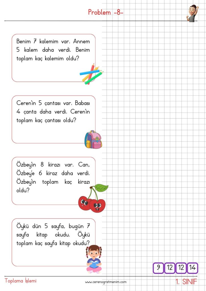 Toplama işlemi için eğlenceli ve öğretici etkinlikler! Çocukların matematik becerilerini geliştiren kolay ve anlaşılır çalışma sayfalarını keşfedin. Problem -8-