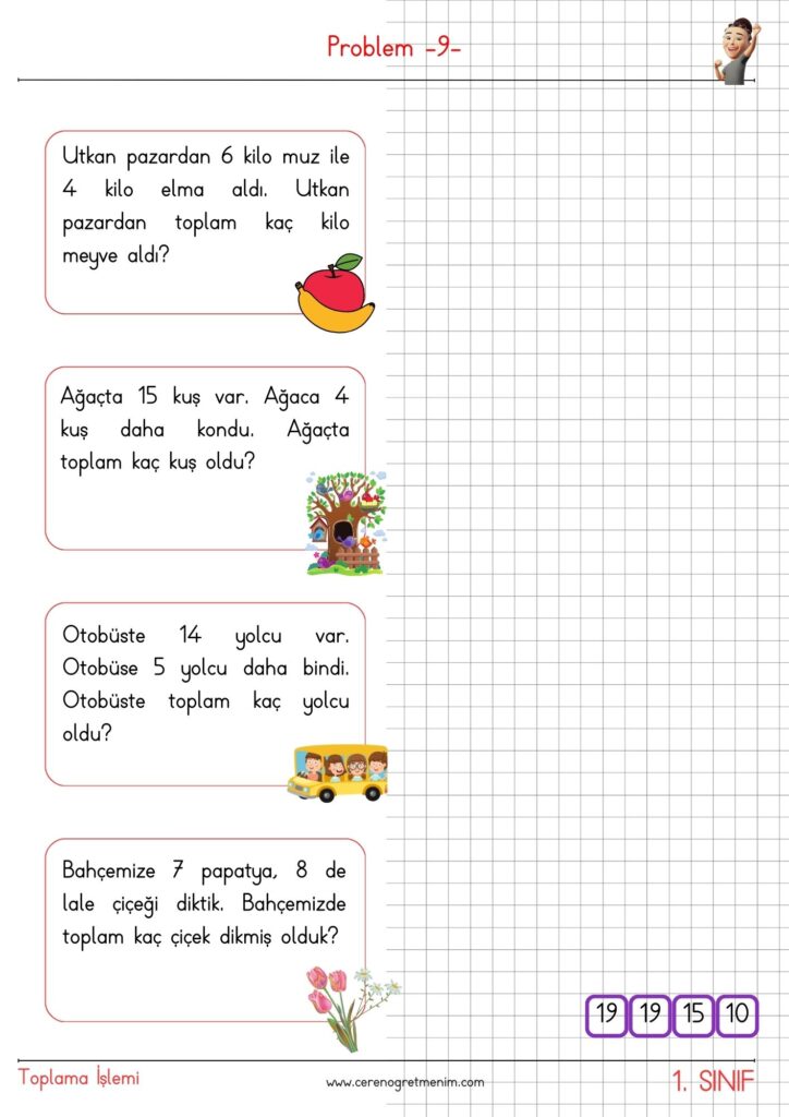 Toplama işlemi için eğlenceli ve öğretici etkinlikler! Çocukların matematik becerilerini geliştiren kolay ve anlaşılır çalışma sayfalarını keşfedin. Problem -9-