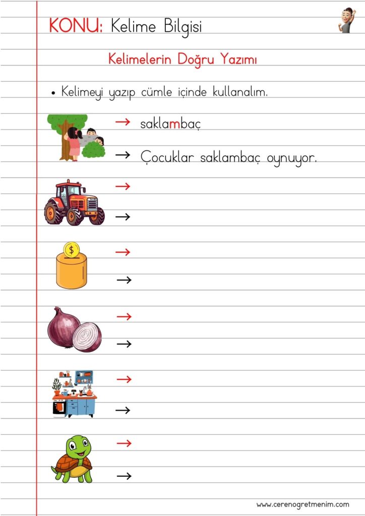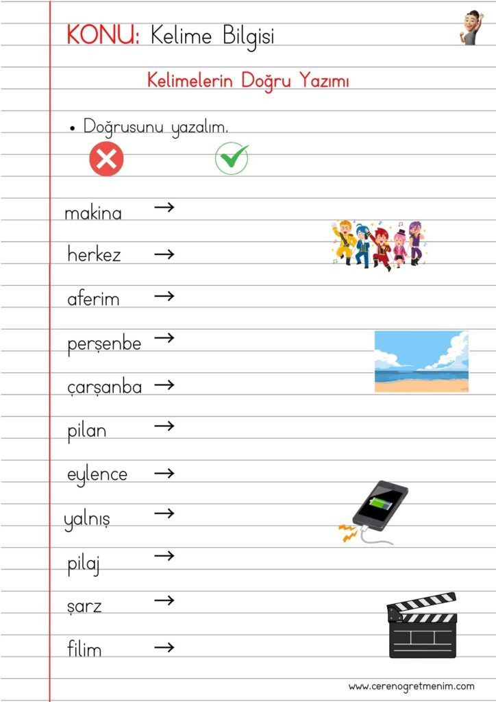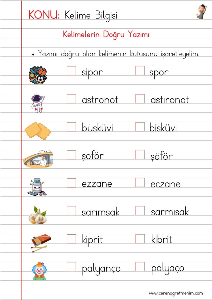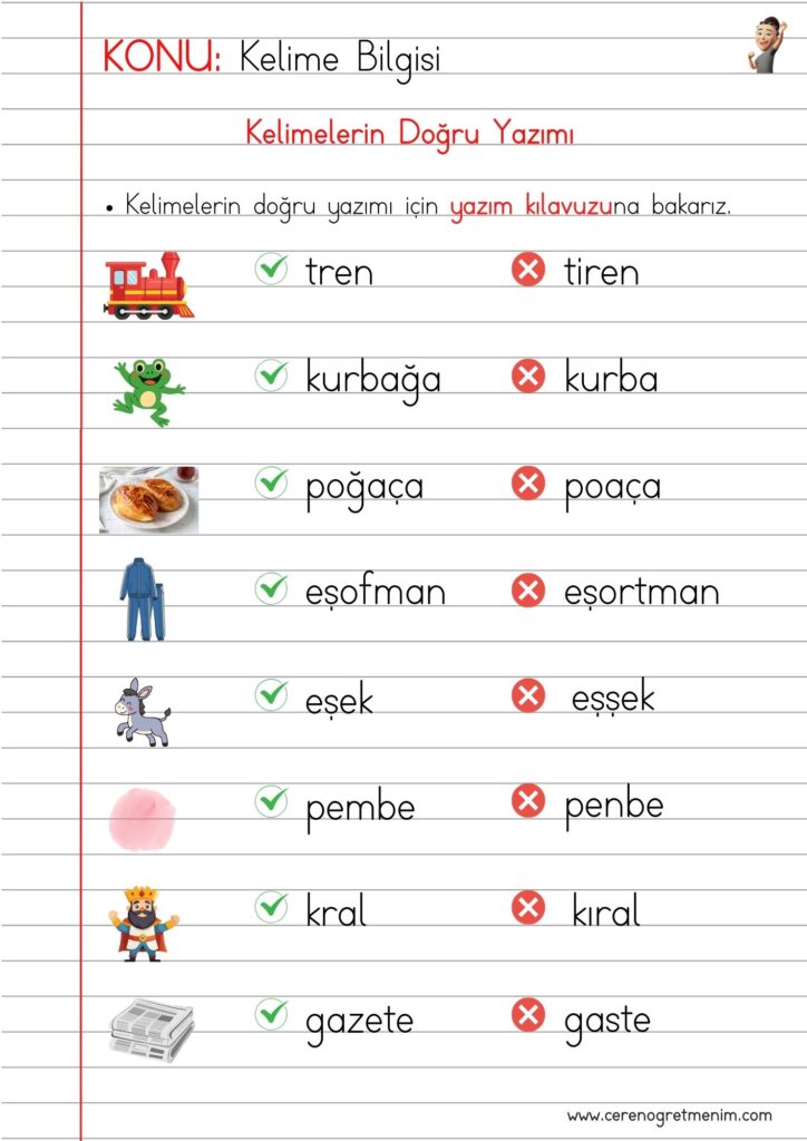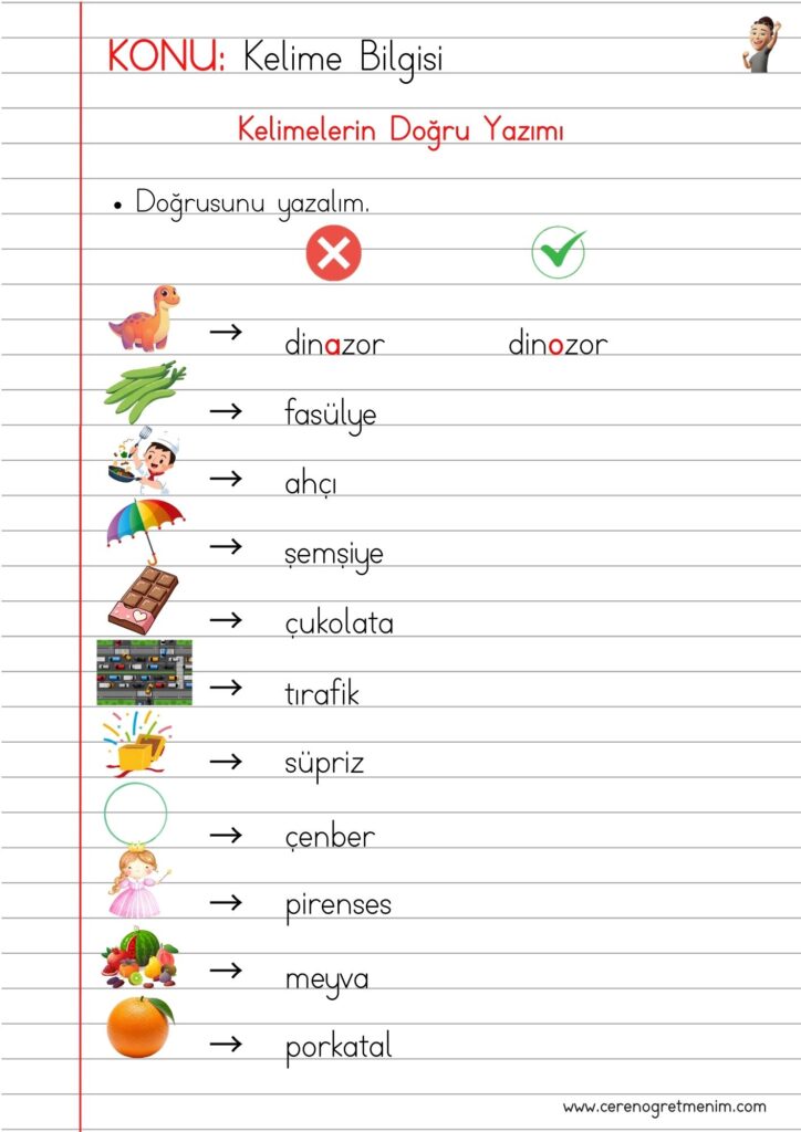 Kelimelerin doğru yazımı etkinlikleri, yazım kuralları örnekleri ve doğru–yanlış kelime çalışmalarıyla eğlenceli öğrenme içerikleri burada! ✏️📚
