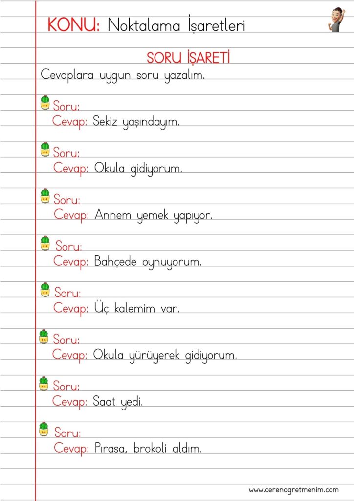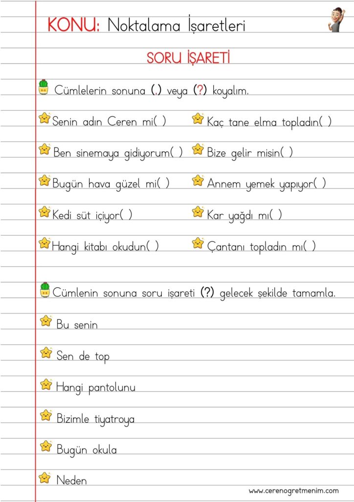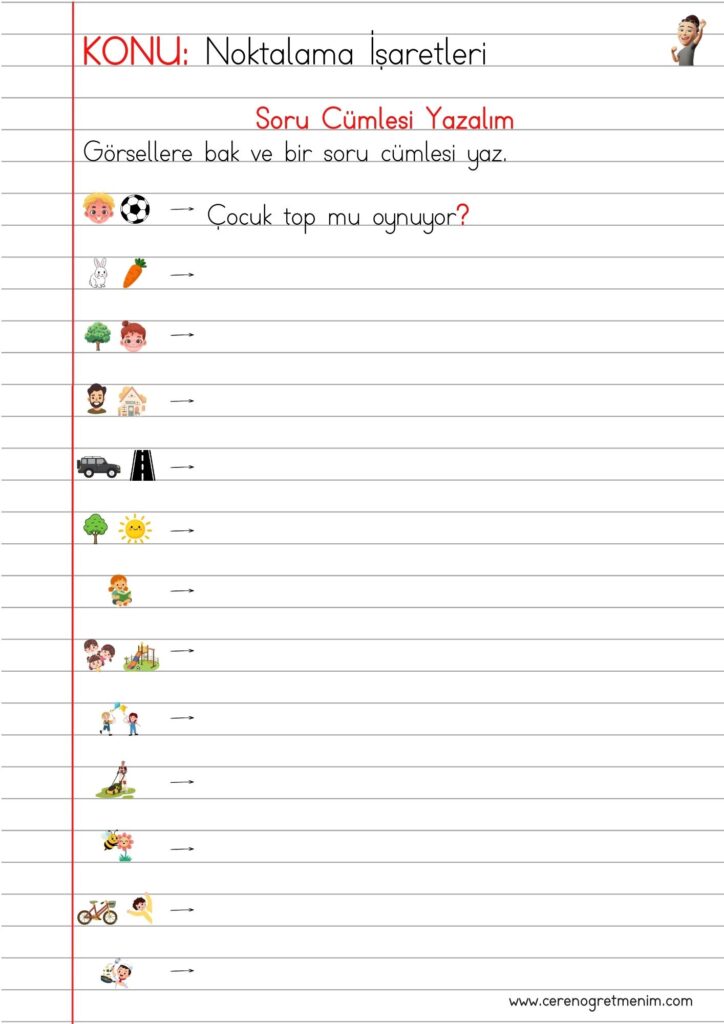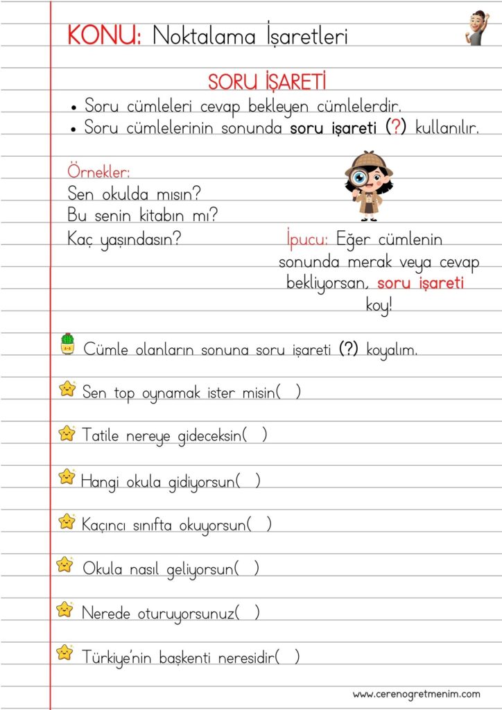 Soru işareti kullanımı konu anlatımı ve etkinlikleri. Soru cümlelerini öğrenmeye yardımcı eğlenceli çalışma sayfaları ve örnekler.