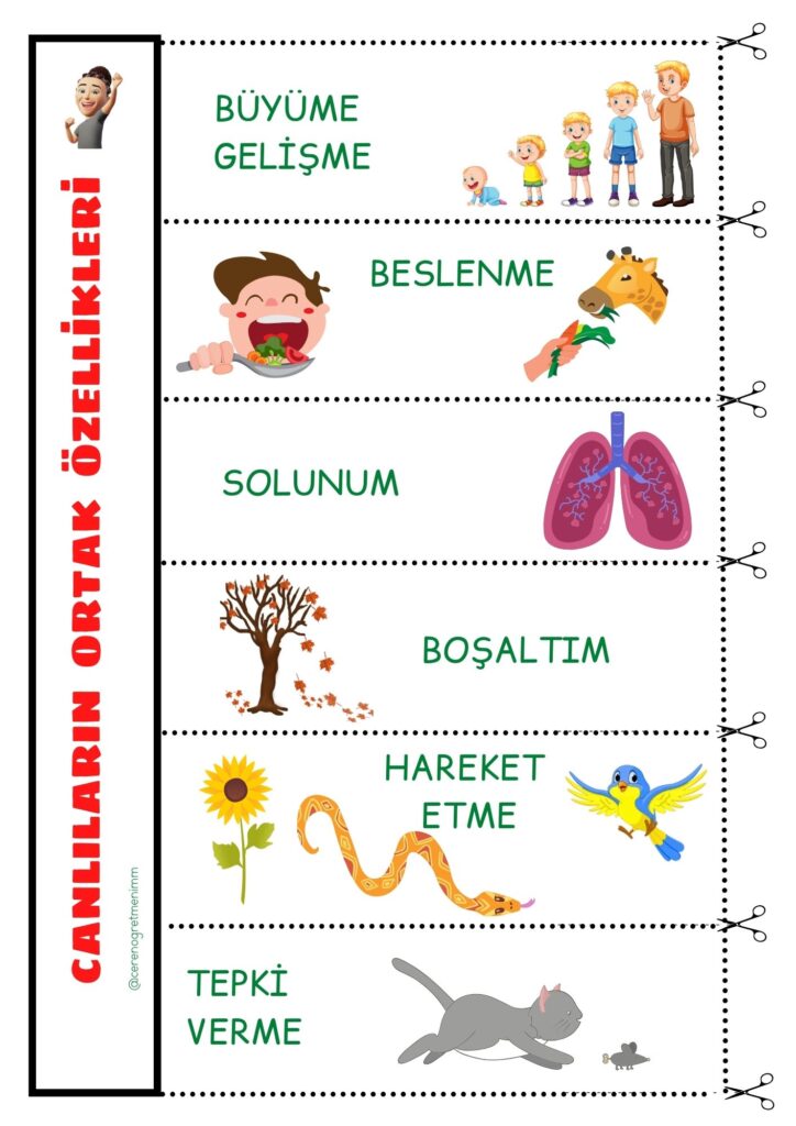 “Canlıların Ortak Özellikleri” konusu için defter notu ve etkinlikler. Büyüme, beslenme, üreme ve hareket gibi özellikleri öğrenciler için anlaşılır şekilde