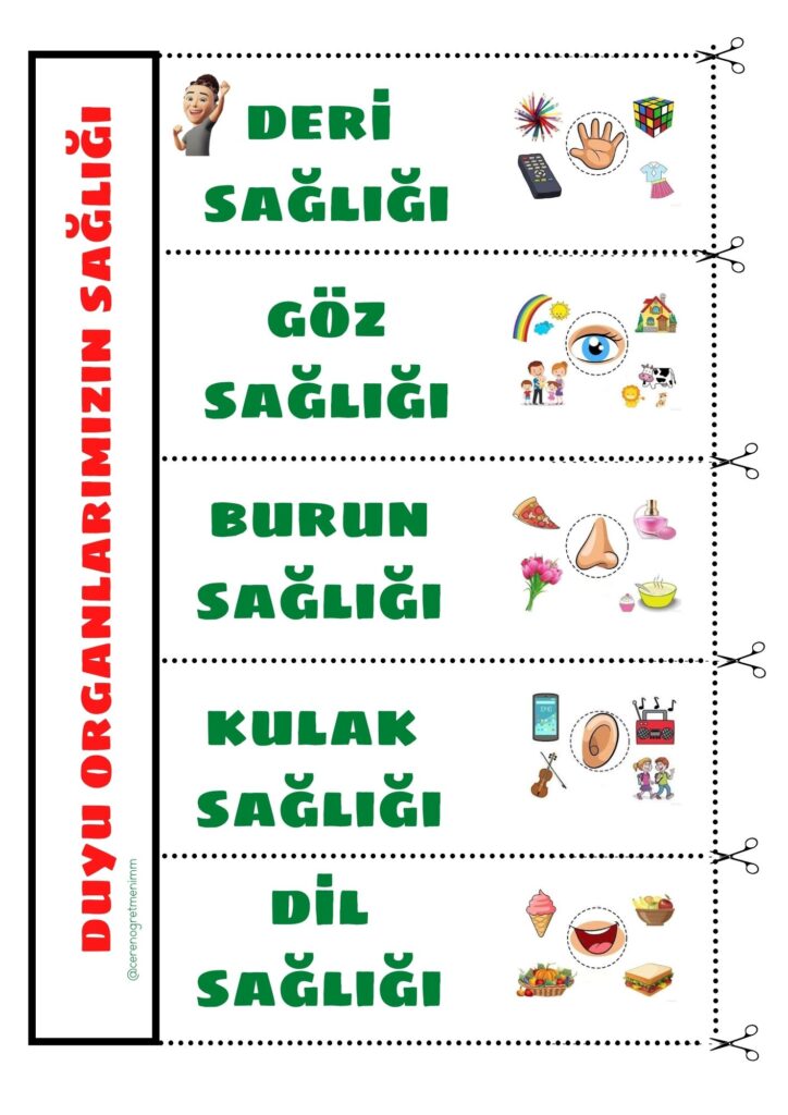 Duyu organlarımızın sağlığı konusu için defter notu ve etkinlikler. Göz, kulak, burun, dil ve deriyi koruma yollarını öğrenciler için kolayca