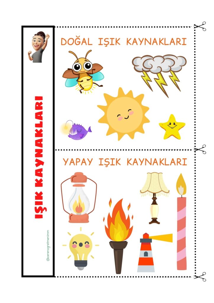 “Işık Kaynakları” konusu için defter notu ve etkinlikler. Doğal ve yapay ışık kaynaklarını öğrenciler için anlaşılır ve eğlenceli şekilde öğrenin.