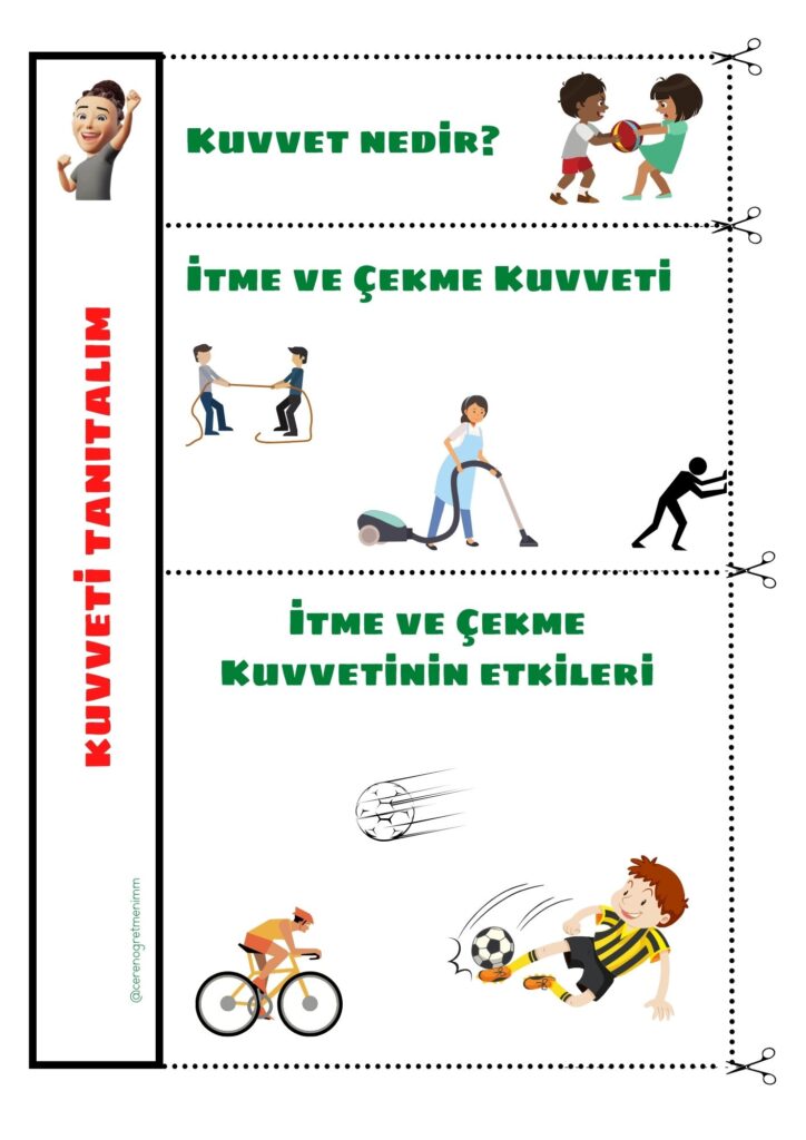 “Kuvveti Tanıyalım” konusu için defter notu ve etkinlikler. Kuvvetin itme ve çekme etkisini öğrenciler için anlaşılır ve eğlenceli şekilde öğrenin.