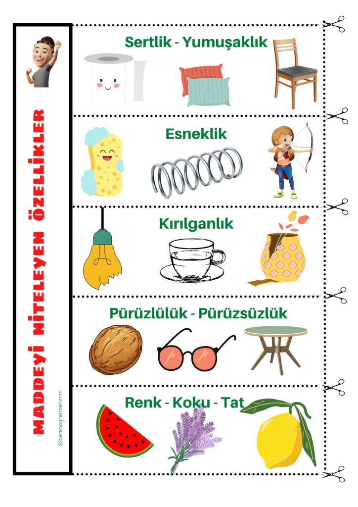 “Maddeyi Niteleyen Özellikler” konusu için defter notu ve etkinlikler. Maddelerin renk, koku, sertlik gibi özelliklerini öğrenciler için kolay öğrenin. 🧪📚